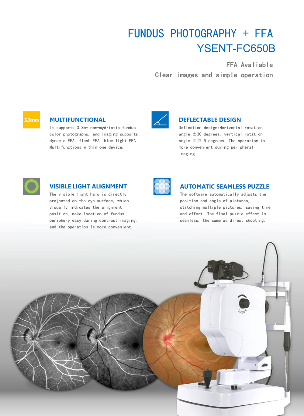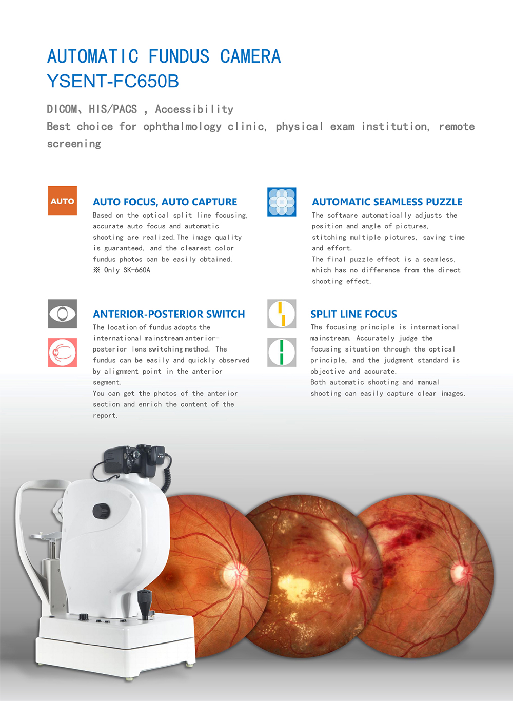 Поддержка DICOM 3.0, поддержка больничных медицинских информационных систем/PACS. Обработка изображений, простота в использовании, мощный анализ, поддержка мозаичного изображения глазного дна, постобработка изображений, измерения, управление профилем пациента.