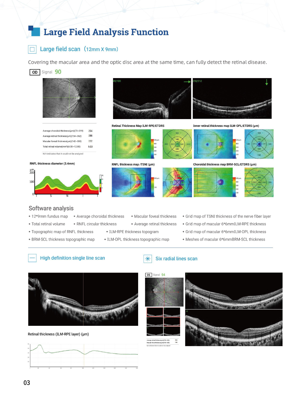 Широкий диапазон сканирования 12 мм × 9 мм: охватывает макулу и зрительный нерв с точными количественными результатами.