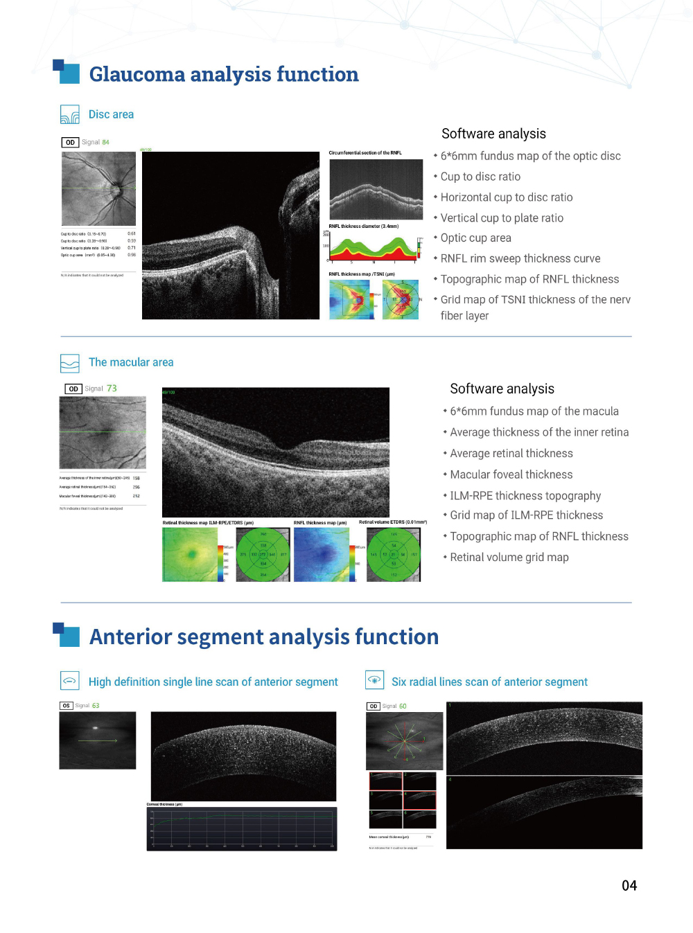 Помогает в дополнительной диагностике 16 основных поражений глазного дна. Предоставляет надежные количественные данные (например, толщина центральной макулы, средняя толщина хориоидеи).